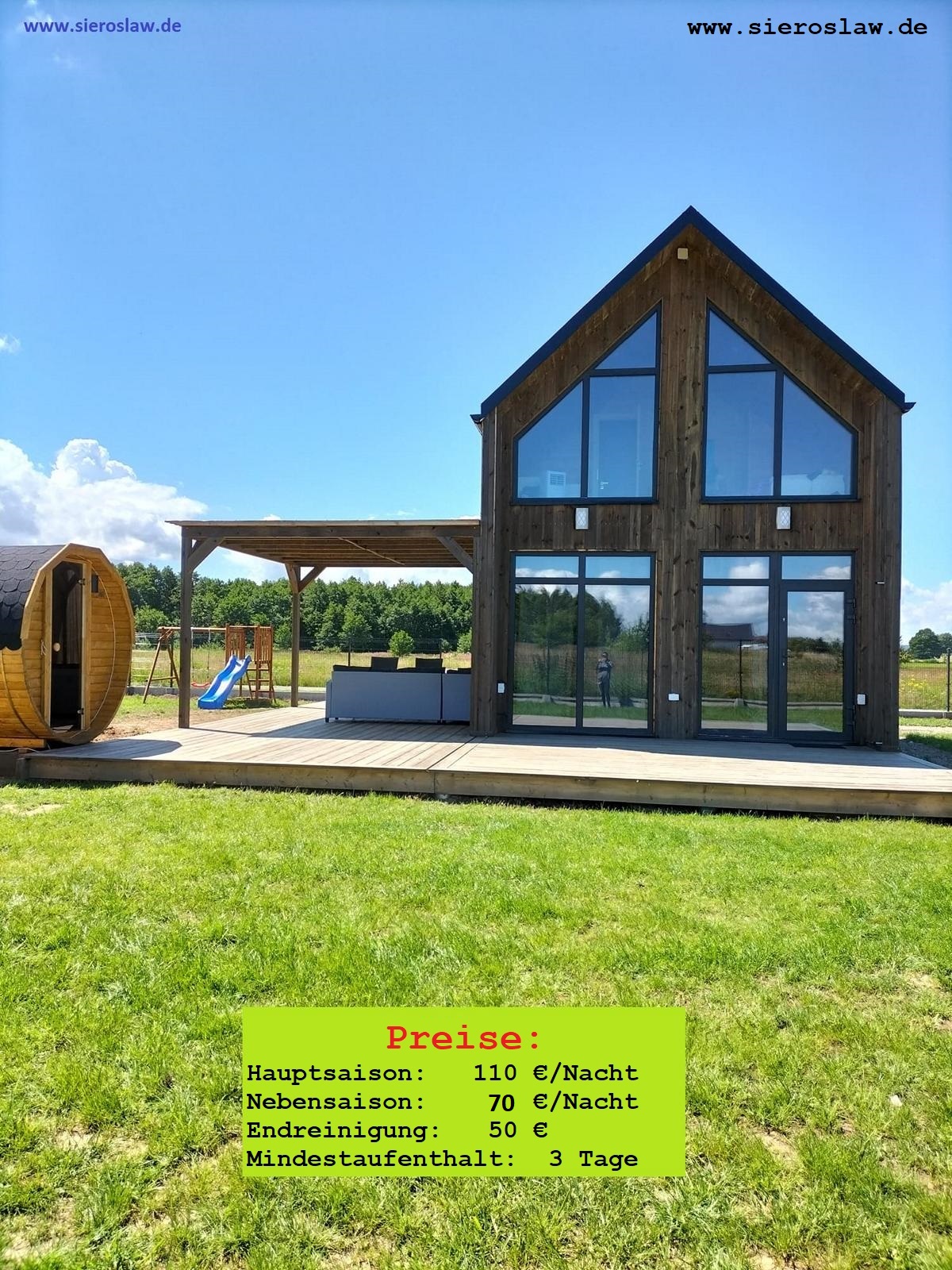 Das neu erbaute Ferienhaus im ruhig gelegenen Sieroslaw, liegt nur 6 km vom wunderschönen Sandstrand in Miedzywodzie - besonders geeignet für Familien mit Kindern. Das Ferienhaus bietet Schlafmöglichkeiten für max. 7 Personen.